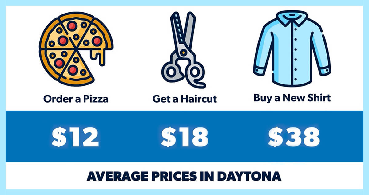 Daytona falls right in the middle of Florida cities for miscellaneous costs. In Daytona, the typical resident can order a pizza for $12, get a haircut for $18, and buy a new shirt for $38. For reference, those prices are $12, $26 and $38 for the average U.S. city.